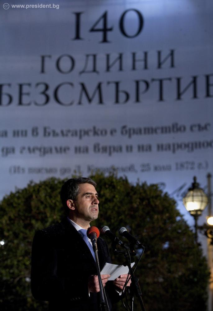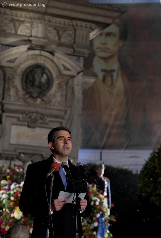 Мирът, разбирателството и прогресът не са даденост, а за тях трябва да се работи всеки ден, защото „дела ни трябват, не думи”. Това заяви президентът Росен Плевнелиев в словото си на възпоменателната церемония по повод 140-годишнината от гибелта на Васил Левски, която се проведе пред Паметника на Апостола в София. „Във всяка епоха ще се намерят хора, които да забравят неговата повеля и които да направят опит да отрекат най-дълбоките и същностни черти на българския народ”, предупреди в речта си държавният глава. Затова, по думите му, заветите на Васил Левски трябва да бъдат повтаряни, а децата на България да бъдат възпитавани „в духа и вярата на Апостола”.