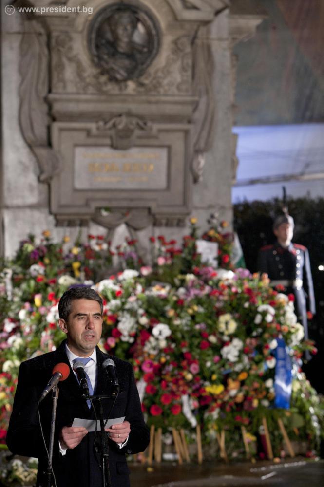 Президентът Росен Плевнелиев участва във възпоменателната церемония по повод 140 години от гибелта на Васил Левски пред Паметника на Апостола в София.
