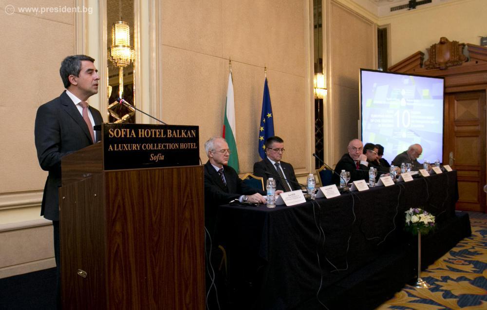 „През последните години сме свидетели на вълни от спонтанни граждански протести, на нарастващо социално напрежение и рекордно ниски нива на доверие в институциите и към политиците в България, но и в Европейския съюз и по света като цяло. Повишава се ролята на гражданското общество – то изисква промяна в дневния ред на институциите и очаква прозрачност и прогнозируемост в управлението, отчетност, стабилни институции, отворени към гражданите и решаващи ефективно социално-икономическите проблеми“, каза президентът Росен Плевнелиев. Държавният глава подчерта, че днес повече от всякога има нужда от градивен социален и граждански диалог и от диалог между институциите и обществото.