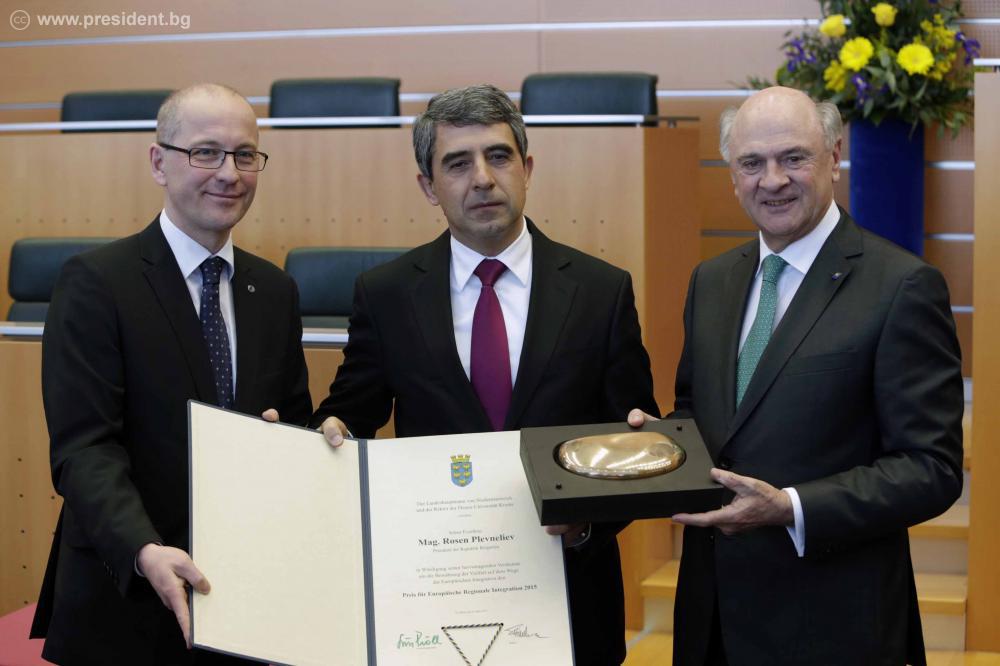 По време на церемонията премиерът на Долна Австрия д-р Ервин Прьол определи твърдата позиция и застъпничество на президента Росен Плевнелиев за силни региони в Европа като един от мотивите за присъждането на наградата. „Европа трябва да залага именно на регионите в бъдещото си развитие“, допълни Ервин Прьол и посочи, че България е силен застъпник на проевропейския курс. Министър-председателят на Долна Австрия определи президента Росен Плевнелиев като символ на стабилност и предвидимост, важен и диалогичен партньор на Австрия по въпросите от европейския дневен ред. „Президентът Плевнелиев е човек с демократично мислене и европейско съзнание и връчената награда е признание за качествата му като държавник, политик и европеец“, подчерта още Ервин Прьол.