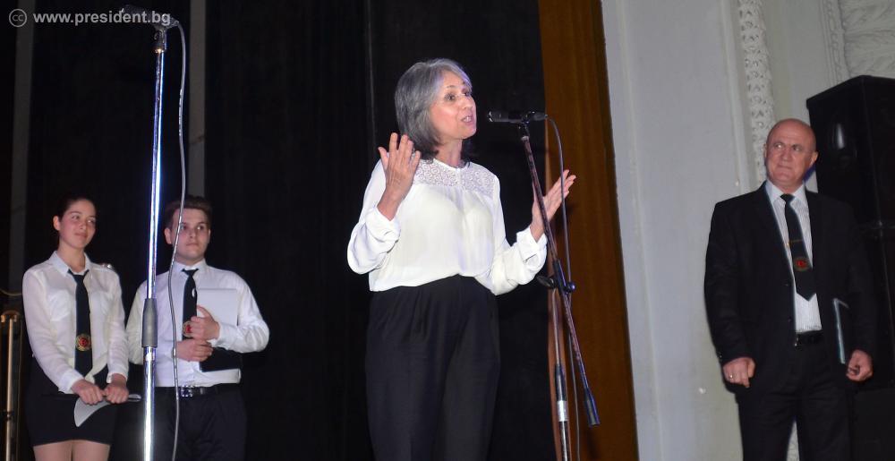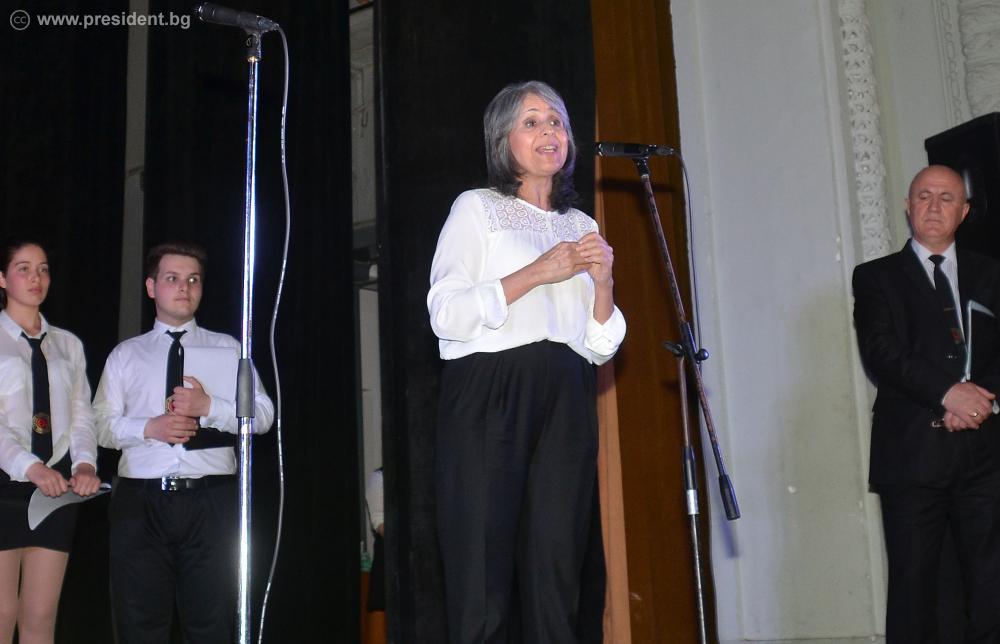 „Благодаря за възможността всички заедно да покажем на нашите деца готовността си да се жертваме за тях, да ги обичаме безкрайно и да им гласуваме доверие, защото те са бъдещето на отечеството ни“, заяви Маргарита Попова в приветствието си по случай празника. Вицепрезидентът подчерта таланта на възпитаниците на училището и взаимното уважение между ученици и учители. „Затова училището го има толкова дълги години – защото в него живеят и учат творци и родолюбци, които знаят как да се обичат и уважават“, каза Маргарита Попова. Вицепрезидентът допълни, че винаги ще помни гимназията със сърдечността на учениците и учителите, които преди две години организираха с нейна подкрепа благотворителна кампания за лечението на един от учениците в гимназията.