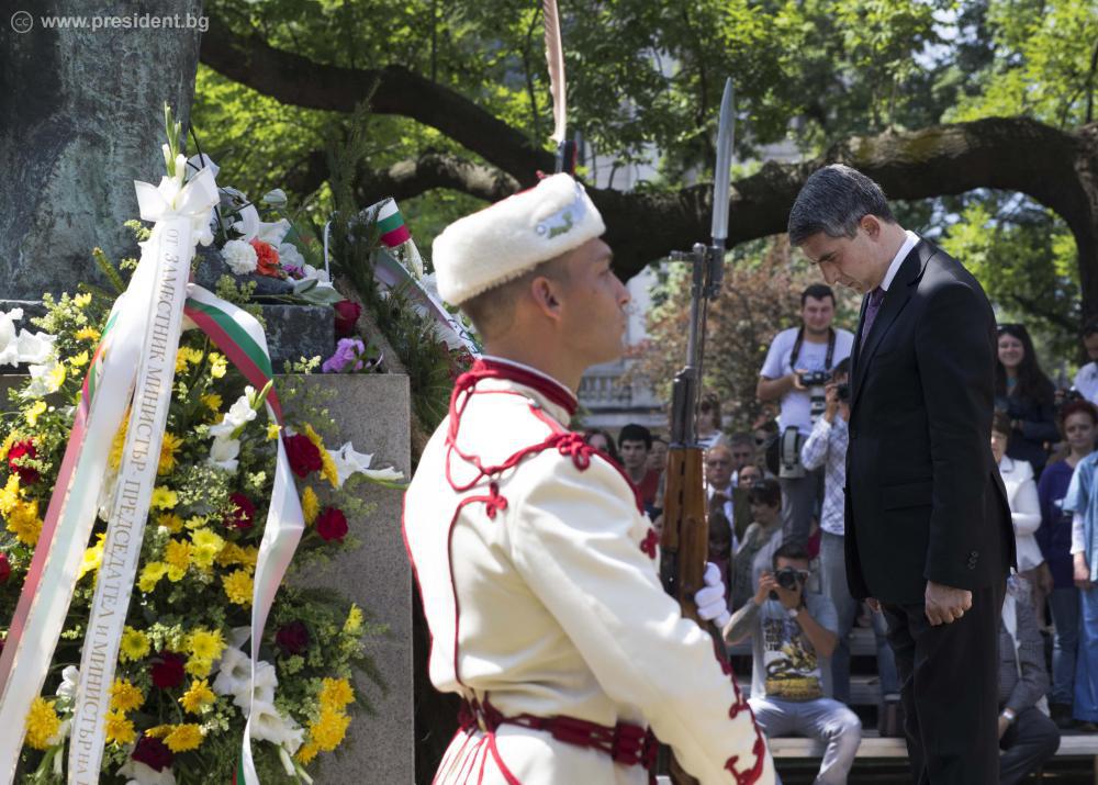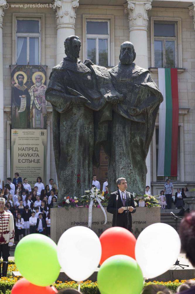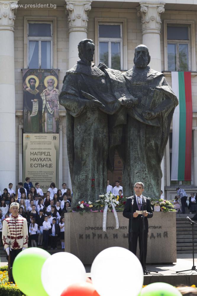 Те ще ни напомнят още веднъж, че модерната българска държавност има здрави корени и че е наш дълг винаги да работим за нейното укрепване и утвърждаване. В настоящия век на динамични промени и предизвикателства пред нас се изправя най-високата отговорност - да формираме образовани и отговорни граждани. За това е нужно да реформираме училищната система и да я пригодим максимално към изискванията на съвременния свят. За да успеем в епохата на глобалните мрежи и на високите технологии трябва да изградим икономика на знанието. Към непреходния възрожденски идеал за просвещение трябва да добавим най-добрите достижения на модерното време. Бъдещето е на иновациите, на човешкия талант и знание. За да успеем в бъдещето трябва да дадем тласък на народното просвещение. За да има бъдеще трябва да пазим и развиваме делото на Светите братя Кирил и Методий, които запалиха вечния огън на българската духовност.