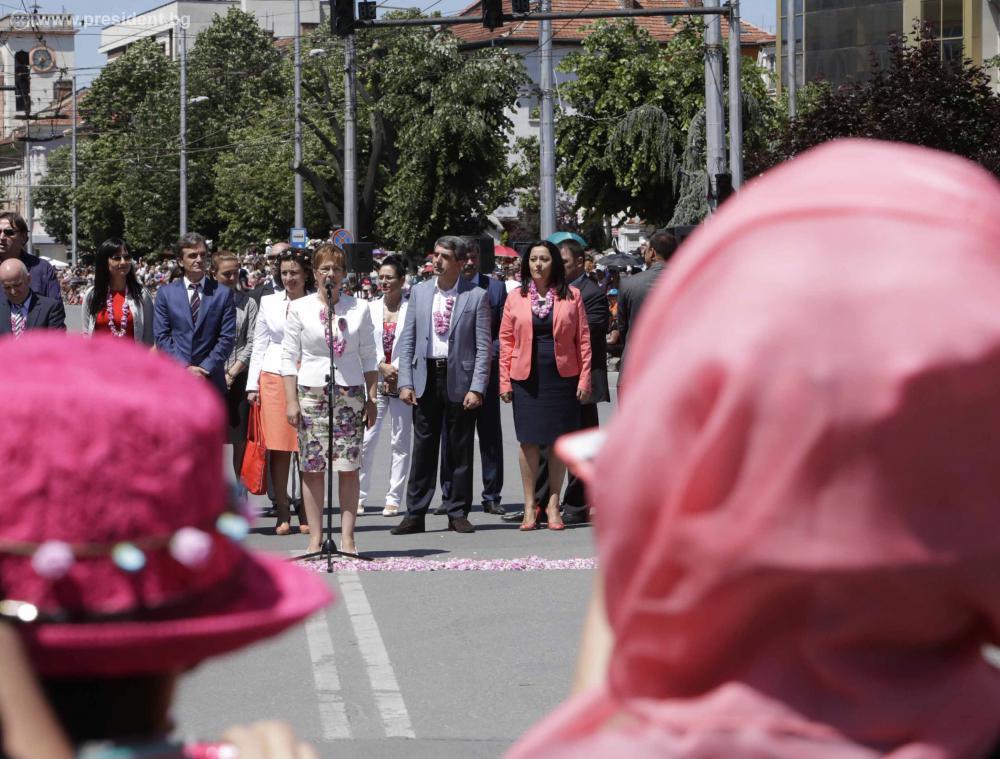 Снимки: В. Николов„Розата е най-разпознаваемият български символ и сме длъжни да защитим това световно постижение на България“, заяви държавният глава Росен Плевнелиев в приветствието си към жителите и гостите на Казанлък, където взе участие в заключителните тържества за Празника на розата в подбалканския град. Президентът, представители на местните власти, министри и стотици граждани наблюдаваха традиционното шествие по случай празника.