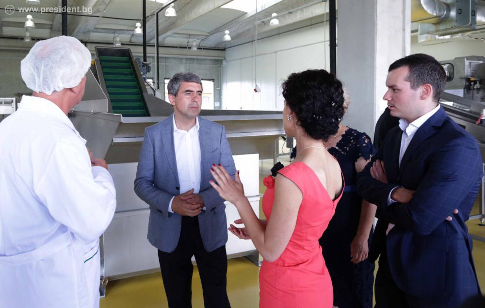 Президентът беше гост и на семейното предприятие „Натура Фит-Хисаря“ в с. Старо Железаре. „Държавата не трябва да прави бизнес, а да бъде платформа за бизнеса и да го подпомага с информация и с контакти на потенциални партньори“, коментира държавният глава, след като се запозна с производствения процес на фирмата.
