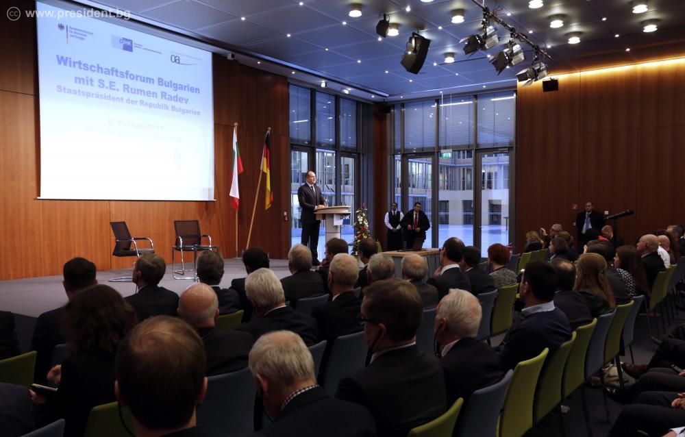 „Международните кредитни агенции дадоха своя положителен кредитен рейтинг за България и като перспектива за развитие. Обръщам се към вас, ние сме отворени за диалог, за съвместна абота. Ще намерите добра основа, която ще гарантира възвръщаемост. Вярвам, че Германия ще продължи да бъде активна по отношение на инвестициите у нас“, заяви Румен Радев.