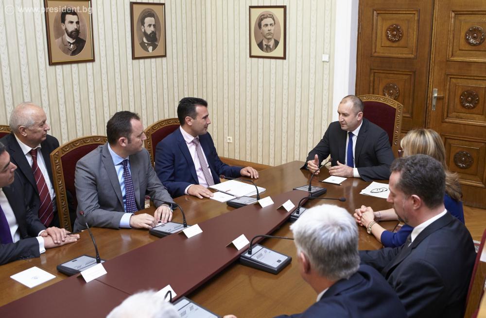 По време на срещата президентът Радев потвърди подкрепата на страната ни за евроатлантическата и европейската перспектива на Република Македония. Гаранция за тази подкрепа е сключването в скоро време на двустранен договор за добросъседство, който ще създаде ясен регламент „за развитието на двустранните отношения по европейски модел“. Президентът Радев приветства направената от премиера Заев категорична заявка за нов подход на приятелство и добросъседство между България и Република Македония и подчерта очакванията на българската страна за конкретни стъпки в тази насока. Държавният глава призова за промяна на подхода на делегацията на Република Македония към страната ни в Съвета на Европа по отношение на процедурата по Рамковата конвенция за защита на националните малцинства, за подкрепа за възстановяването и опазването на българските войнишки паметници, които са част от родовата памет и в двете държави, и за активни действия на политиците, които да създават устойчив климат на доверие между България и Република Македония в публичното пространство.