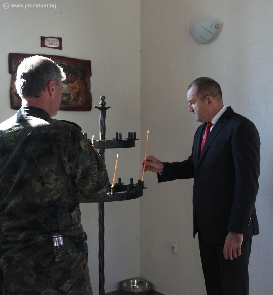 В рамките на посещението си в 61-ва Стрямска механизирана бригада Румен Радев разгледа въоръжението, техниката и войсковото оборудване на бригадата и поднесе цветя пред паметника на загиналите воини във войните за национално обединение 1912 -1918 г.