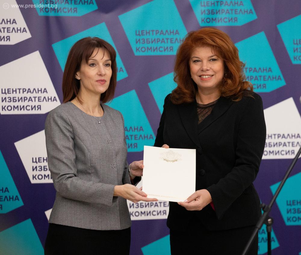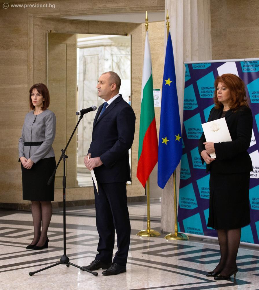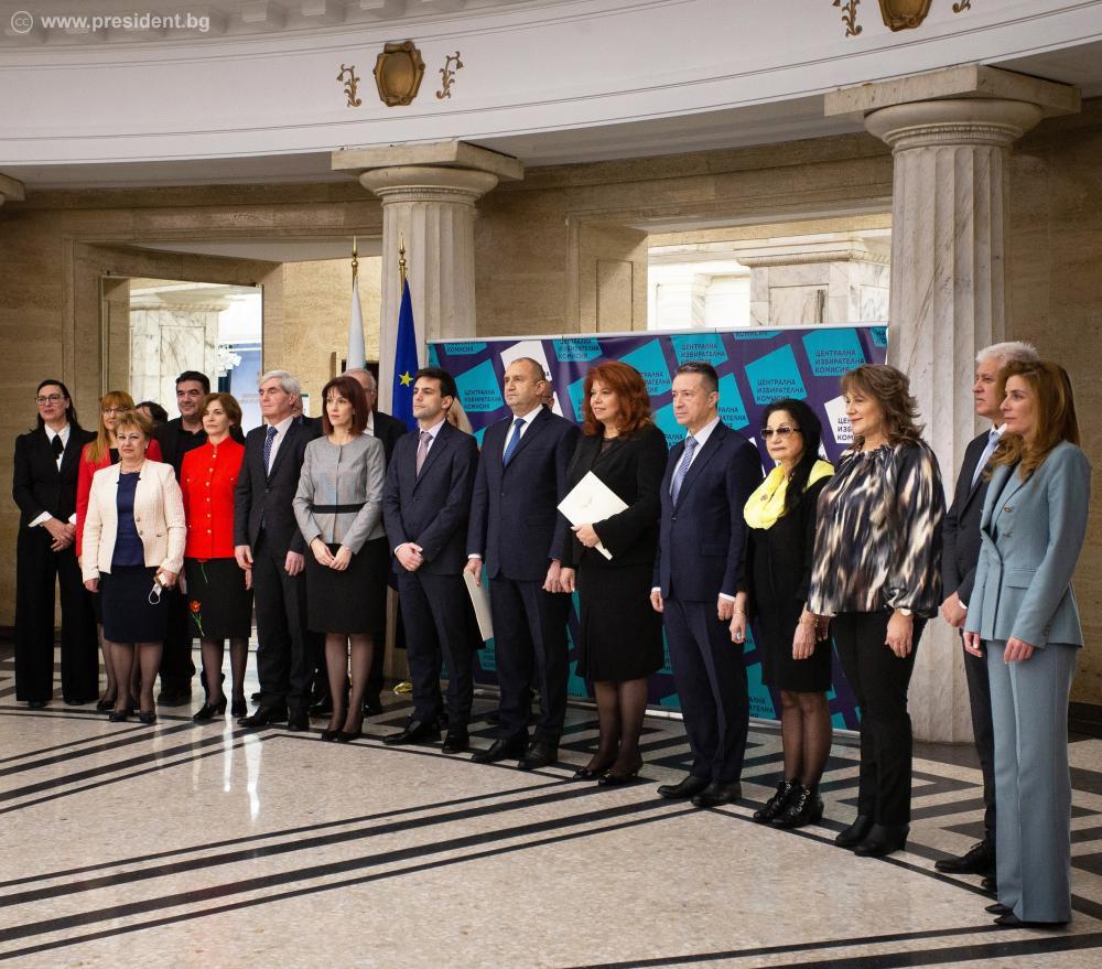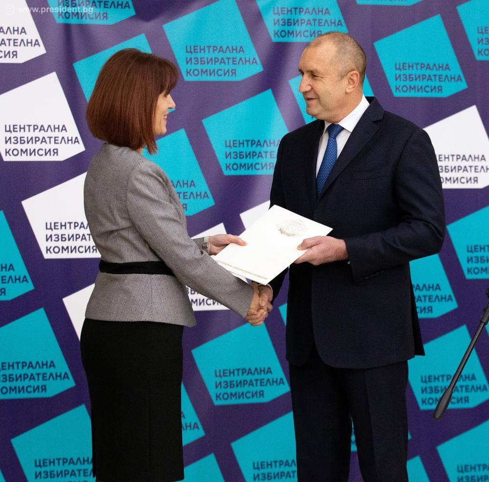 Документите бяха връчени на Румен Радев и Илияна Йотова от председателя на Централната избирателна комисия Камелия Нейкова. В церемонията участваха председателят на Народното събрание Николай Минчев, членове на Конституционния съд, членове на ЦИК и съпредседатели на Инициативния комитет, който издигна кандидатурата на президентската двойка.