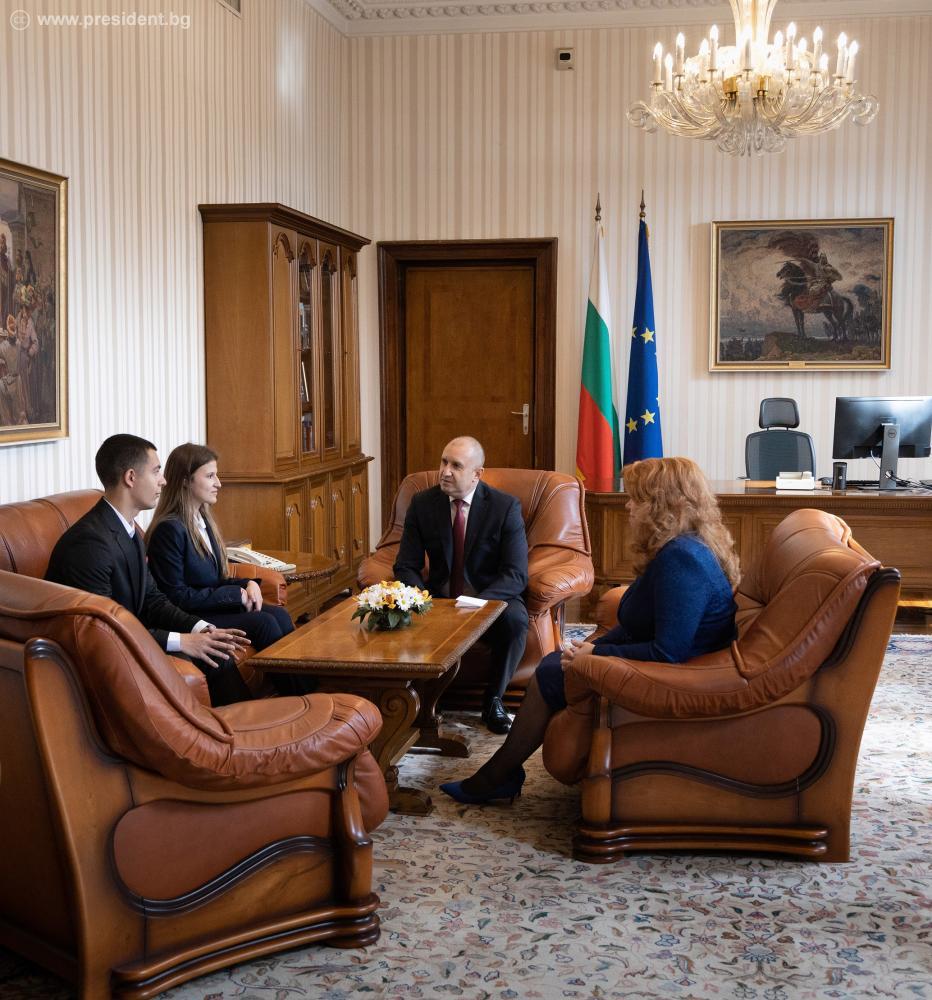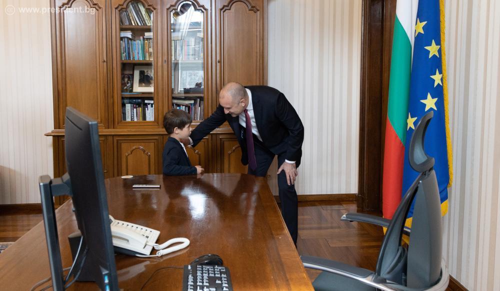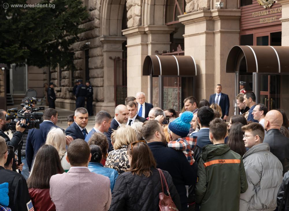 Държавният глава приветства и 18-годишната Тереза Баевска, която стана „президент за един ден“ и се включи в програмата му днес. Момичето учи в Старопрестолна професионална гимназия по икономика, град Велико Търново.