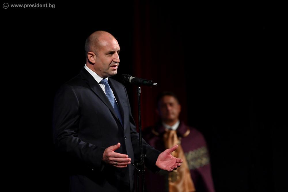 Държавният глава изказа благодарност на академичното ръководство и преподавателския състав за професионализма и всеотдайността им в съхраняването и надграждането на традициите на университета. Румен Радев отбеляза и усилията в преподавателските методи да се обединяват наука, образование и практика. „Вашият университет е храм не само на знанието, но и на духа. Ваша отговорност е да пазите този храм чист, свят и неподправен“, отбеляза още президентът Радев пред студентите, академичното ръководство и преподавателите.