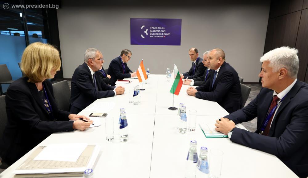 България и Австрия имат активно икономическо и инвестиционно сътрудничество, споделят общи позиции по много теми от дневния ред на Европейския съюз и ще продължат всестранно да развиват двустранното си партньорство. Това беше общата позиция на президентите на България и Австрия Румен Радев и Александер Ван дер Белен, които проведоха днес среща в рамките на срещата на върха на инициативата „Три морета“ в Рига.