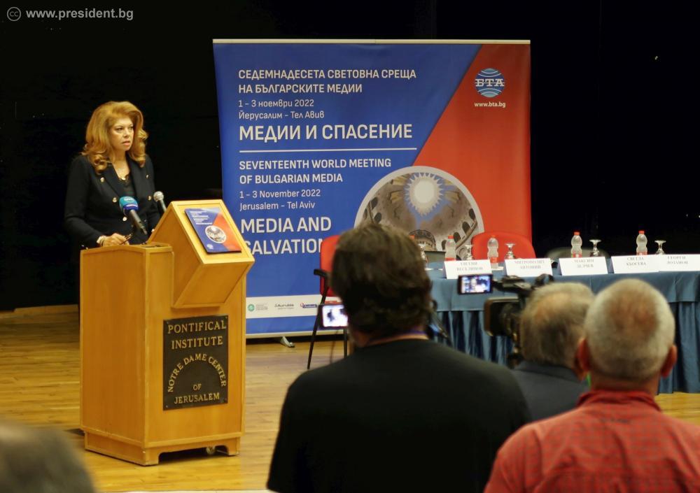 Разговорът за отричането на насилието и омразата и връщането към ценностите на цивилизацията е дело на медиите. Разчитам на вас, колеги, заедно да говорим за тези важни теми. С тези думи вицепрезидентът Илияна Йотова приветства гостите и участниците в XVII Световна среща на българските медии, която се организира от Българската телеграфна агенция и се провежда в Йерусалим и Тел Авив.