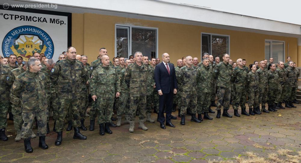 Държавният глава, който днес се срещна с личния състав на 61-ва Стрямска механизирана бригада, изказа благодарност на военнослужещите във формированието за това, че в нелеки условия продължават с достойнство и чест да изпълняват своя дълг, да съхраняват и да развиват нови способности. Президентът изрази очакване да няма забавяне по приемането на бронираните бойни машини „Страйкър“, първите от които по договор трябва да дойдат до края на годината. Румен Радев заяви във връзка със срещата, че военнослужещите са поставили темата за промените в Закона за отбраната и въоръжените сили, които засягат отпуски, компенсации, служебно време.