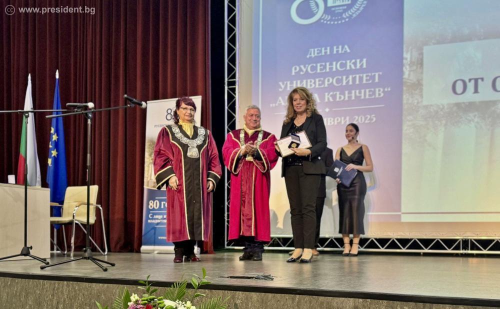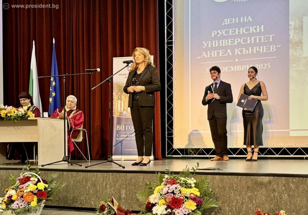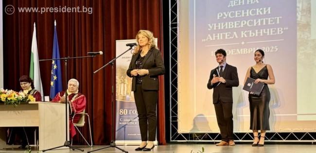 Вицепрезидентът Илияна Йотова беше гост на тържественото честване на 80-годишнината на Русенския университет „Ангел Кънчев“. „Днес е празник за цяла България, защото всички се гордеем с Русенския университет – едно от най-авторитетното и обичани висши училища в страната“, подчерта в приветствието си Йотова.