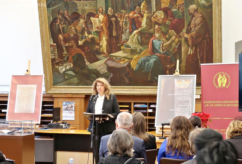 Вицепрезидентът Илияна Йотова откри в Националната библиотека „Св. св. Кирил и Методий“ двудневната Национална научна конференция с международно участие „Азбуки, памет, приемственост“. Събитието е част от събитията под надслов „Година на глаголицата“ и се провежда под патронажа на вицепрезидента.
