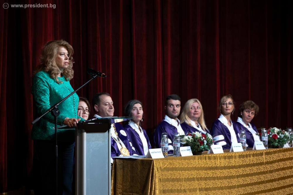 В приветствието си държавният глава открои значението на Медицинския университет в изграждането на специалисти. „Именно от децата, които възпитавате, ще излязат утрешните рицари на надеждата, на човеколюбието. Това ще бъдат нашите български лекари“, заяви президентът. Тя допълни, че израстването на лекарите е резултат от дълга и устойчива традиция, която носи в себе си най-важните достижения не само на Медицинския университет в София и на българското образование.