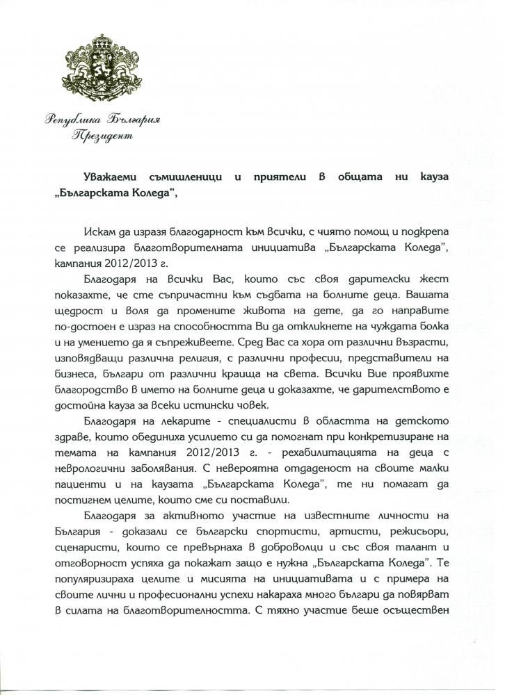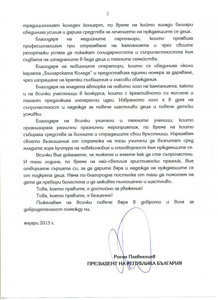 Президентът Росен Плевнелиев изразява благодарност на съпричастните с каузата на благотворителната инициатива под егидата на държавния глава „Българската Коледа”. В откритото благодарствено писмо на президента се казва следното: