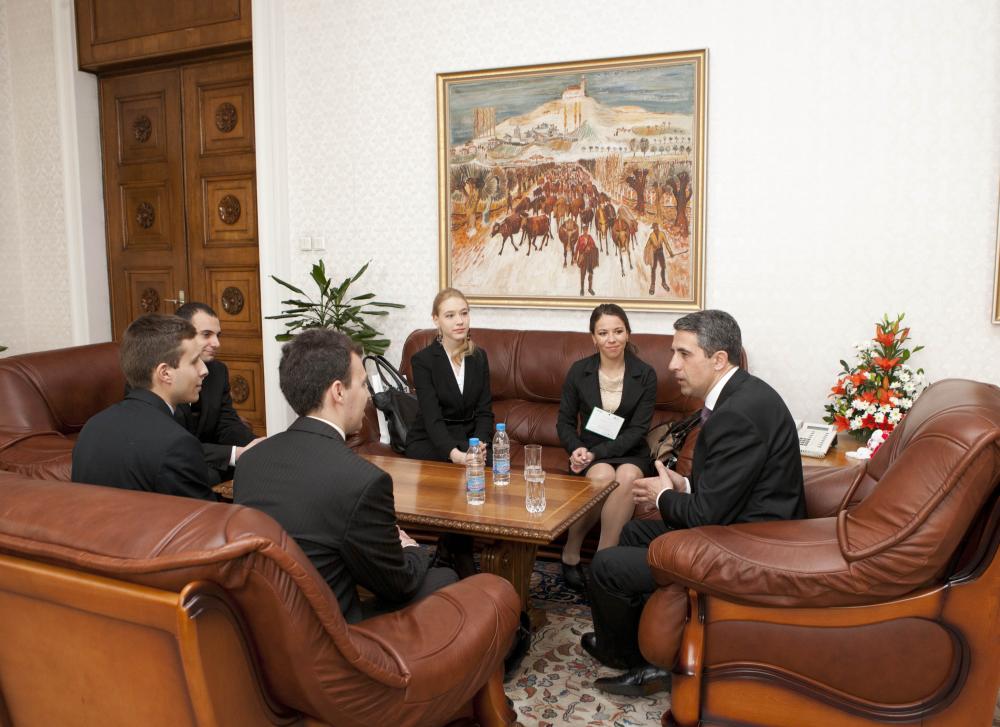 Снимка: В. Николов19 март 2012 г. Президентът Росен Плевнелиев разговаря на "Дондуков" 2 с участници в инициативата "Мениджър за един ден". В рамките на инициативата, организирана от Junior Achievement Bulgaria, пет младежи ще се запознаят отблизо с работата на държавния глава и на неговия екип.