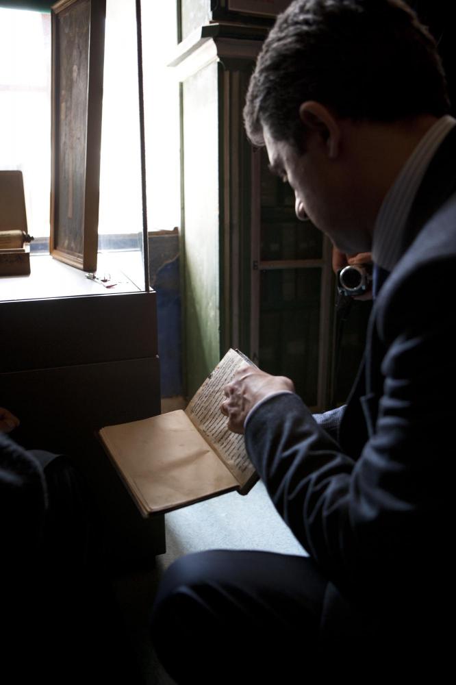 В.Николов15 април 2012 г. Президентът Росен Плевнелиев разгледа старинни ръкописи в Зографски манастир.