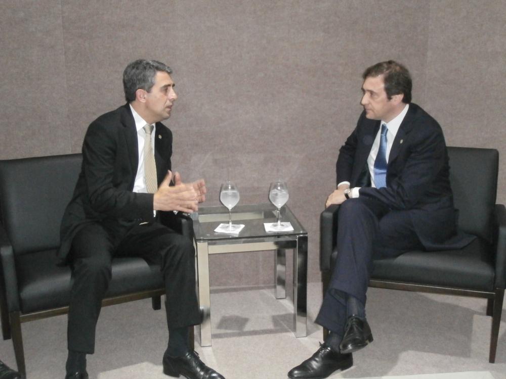 Снимка: Пресцентър20 юни 2012 г. Президентът Росен Плевнелиев се срещна с португалския министър-председател Педро Пасош Коельо в Рио де Жанейро. Държавният глава е в Бразилия за участие Конеференцията на ООН по устойчиво развитие "Рио+20". В първия ден от участието си във форума президентът проведе поредица от двустранни срещи.