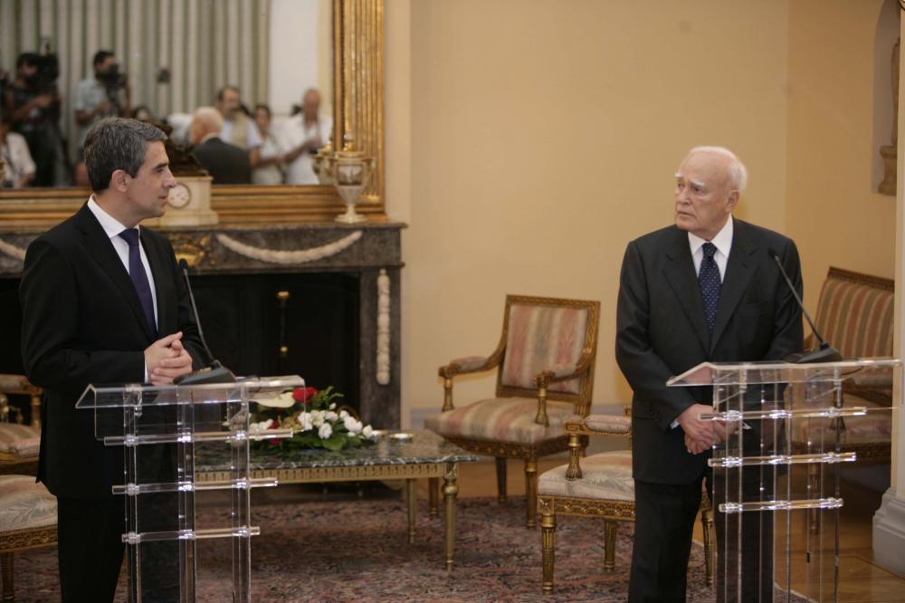 Снимка: В. Николов4 юли 2012 г. В първия ден от официалното си посещение в Република Гърция президентът Росен Плевнелиев се срещна със своя гръцки колега президента Каролос Папуляс.